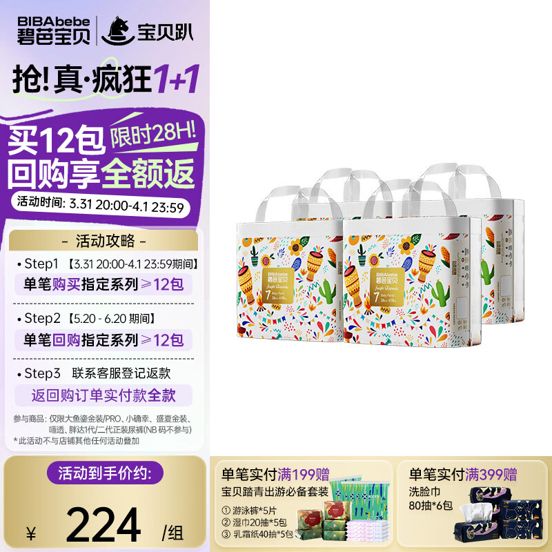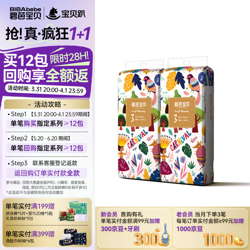 碧芭宝贝【会员专享】丛林狂想曲纸尿裤婴儿成长裤宝宝加大号尿不湿薄透气 纸尿裤M50片*2包(6-11kg)