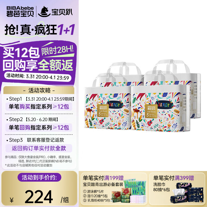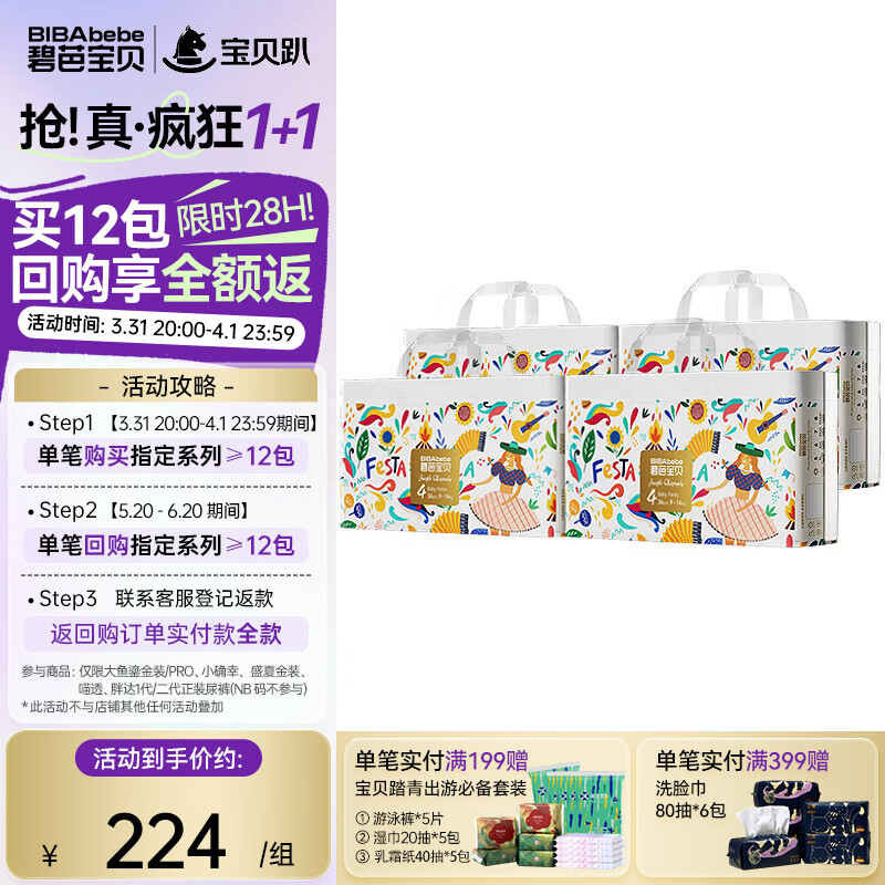 碧芭宝贝丛林狂想曲 宝宝拉拉裤尿不湿婴儿透气训练裤 拉拉裤XXXXL码4包96片