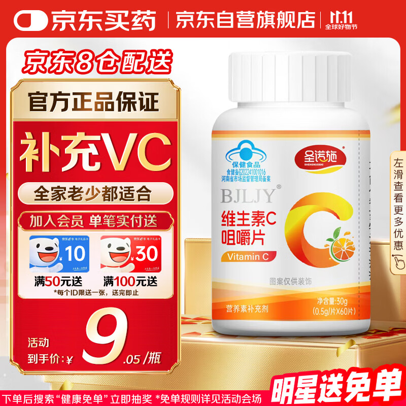 圣诺施 维生素C咀嚼片 儿童成人vc营养补充剂 孕妇中老年补充VC 60片