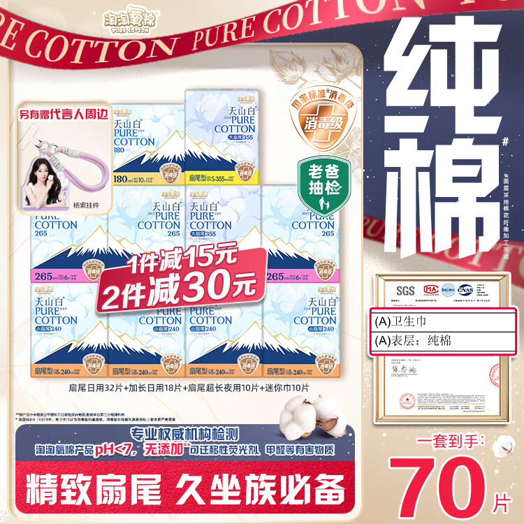 淘淘氧棉天山白消毒级卫生巾纯棉扇尾含迷你日夜组合10包70片