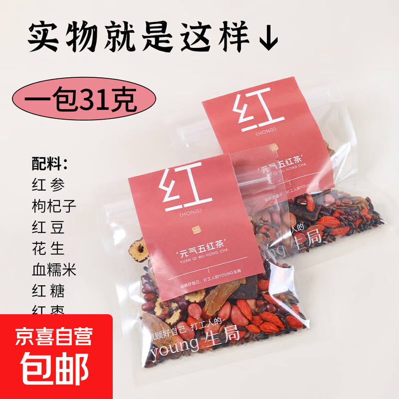 元气五红茶红参枸杞红枣茶红糖红花生整料不打碎一袋31克手工茶 元气五红茶【1袋装】 见包装