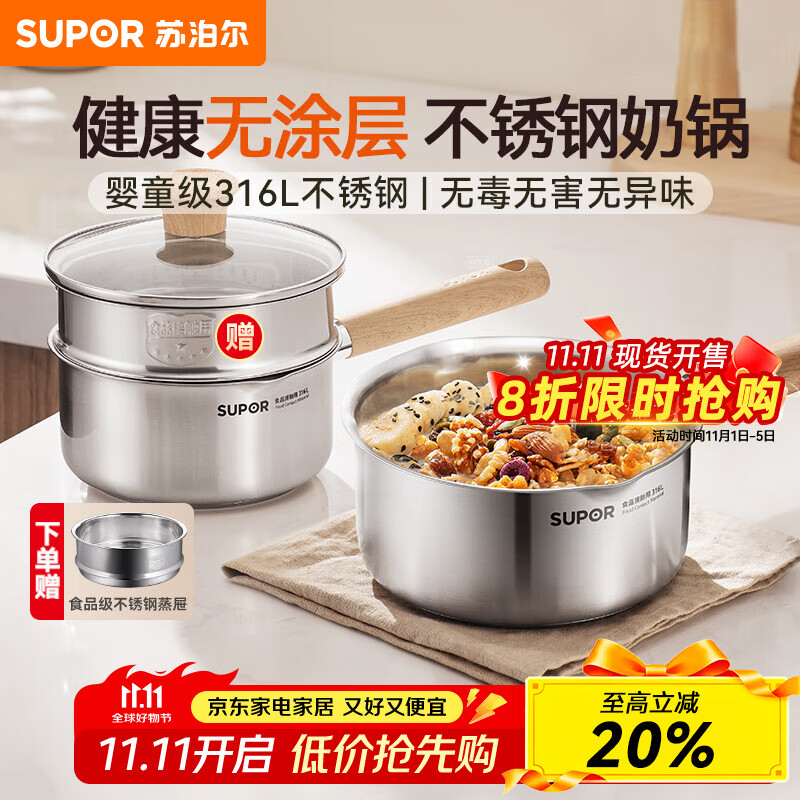 苏泊尔(SUPOR)奶锅316L不锈钢宝宝辅食锅泡面热牛奶小奶锅汤锅电磁炉燃气通用 【推荐】316L不锈钢奶锅- 18cm