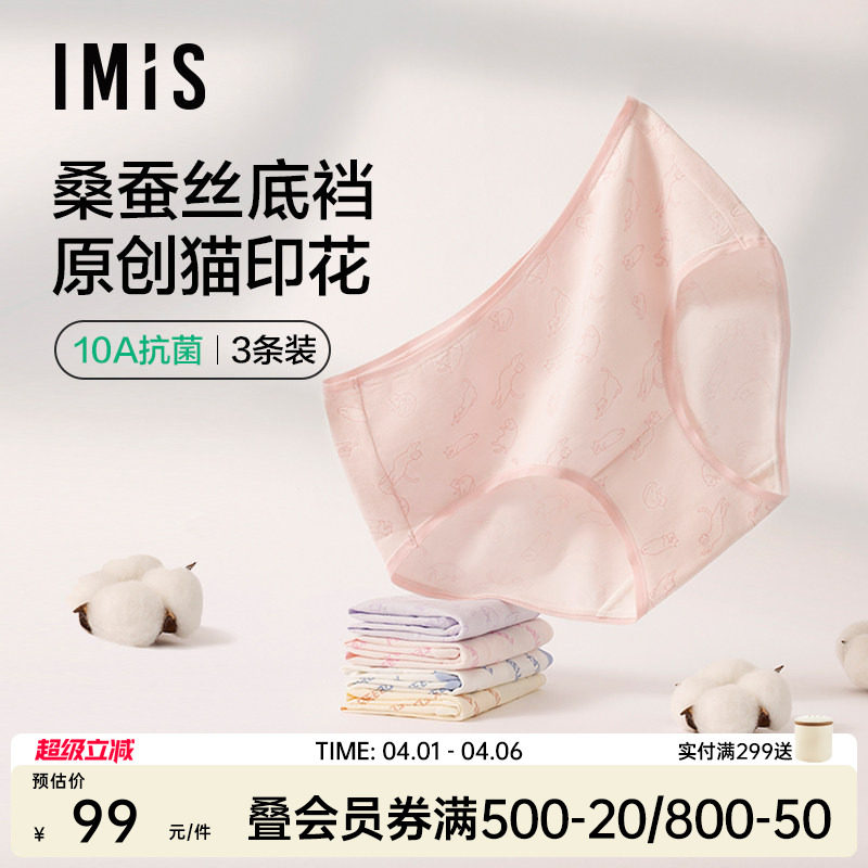 爱美丽3条装印花10A抗菌棉感无痕内裤女士中腰桑蚕丝底裆平角裤薄