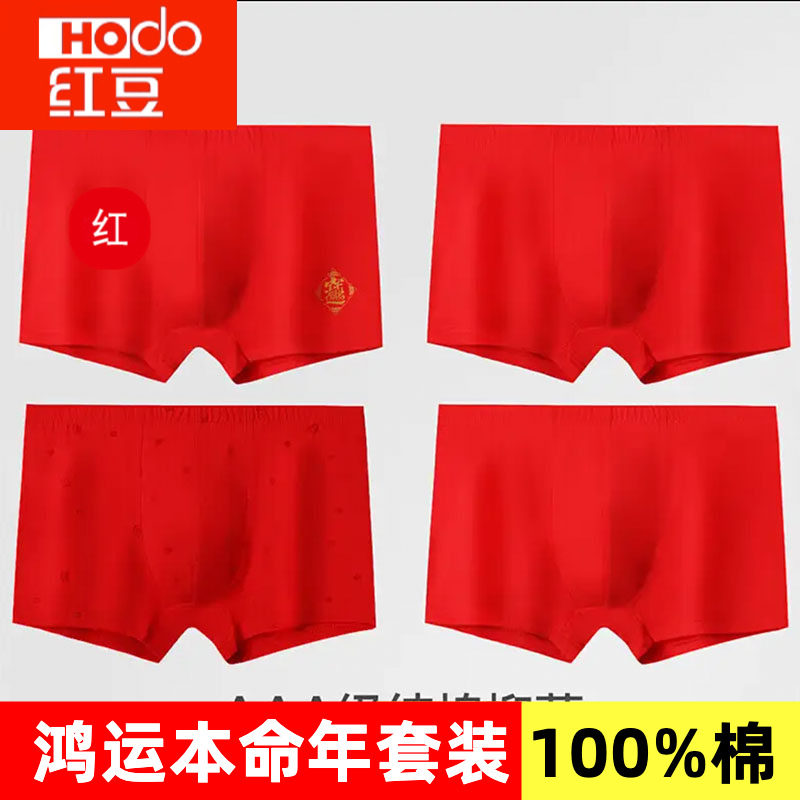 正品红豆2026马年男士100%纯棉抑菌内裤本命年红色结婚平角全棉款