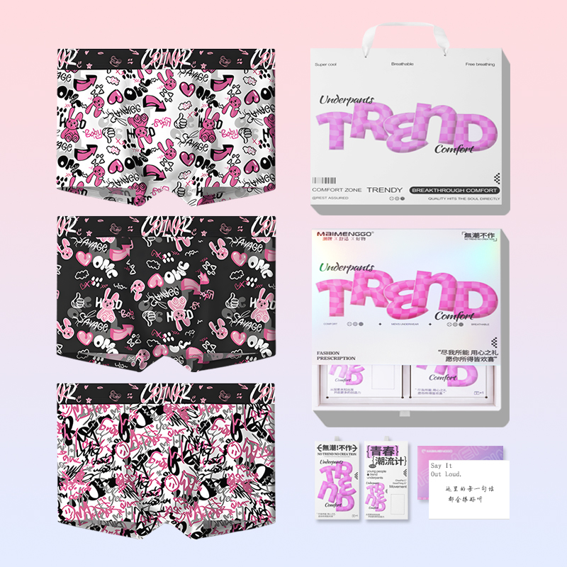 男士内裤男冰丝抗菌透气卡通黑粉印花平角裤宽松中腰舒适男四角裤