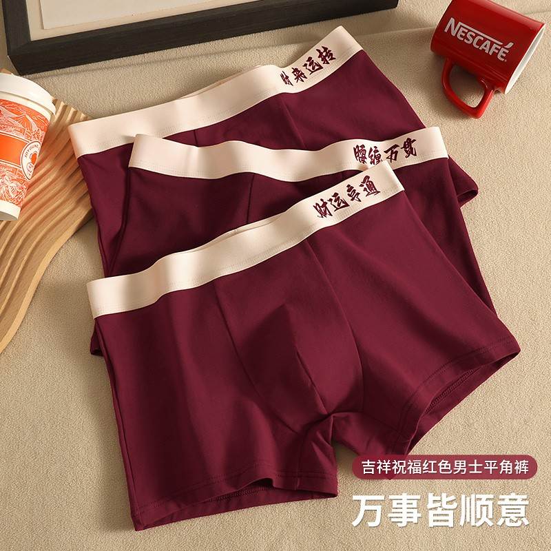 本命年红色男士内裤纯棉透气男生平角裤酒红四角裤结婚喜事短裤头