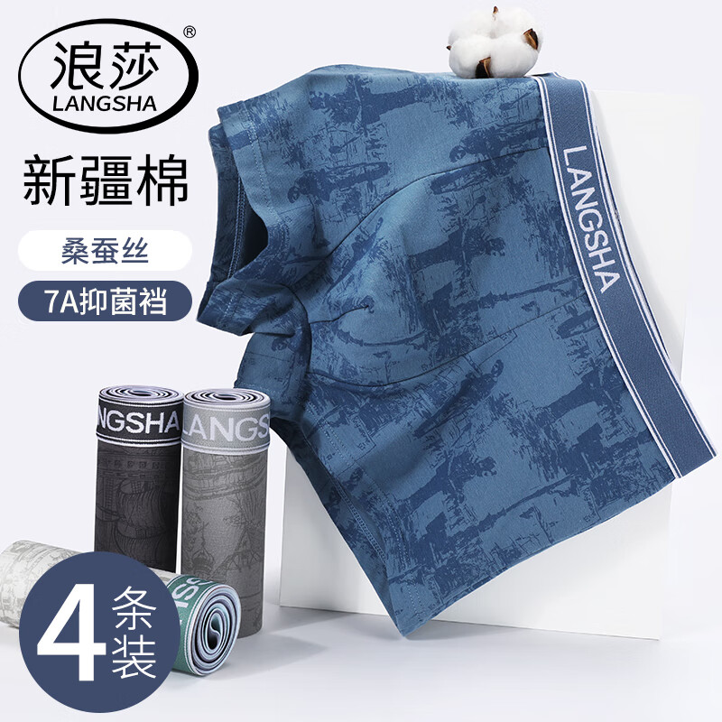 浪莎男士纯棉内裤桑蚕丝7A抑菌平角纯棉春秋季透气不易起球四角裤4条