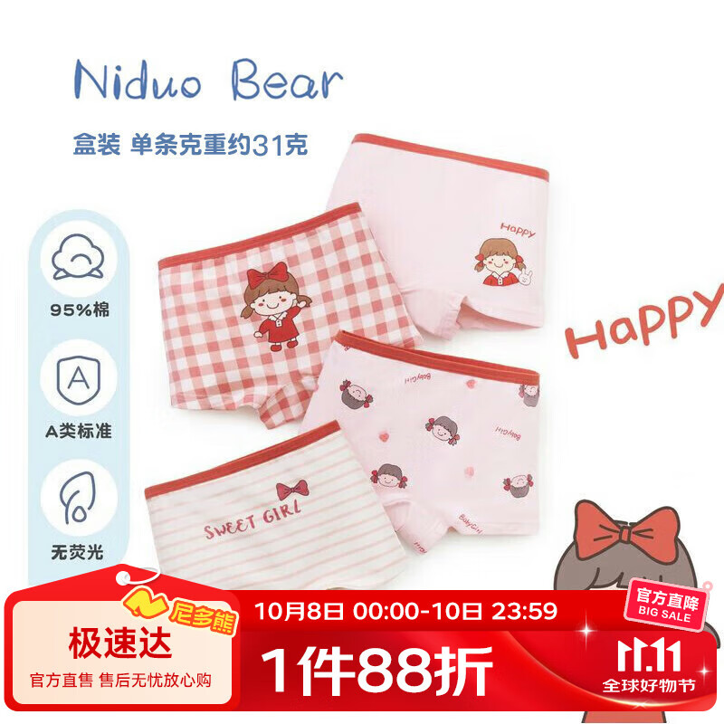 尼多熊儿童内裤女中大童A类平角纯棉婴儿不夹pp透气舒适四角短裤 M码