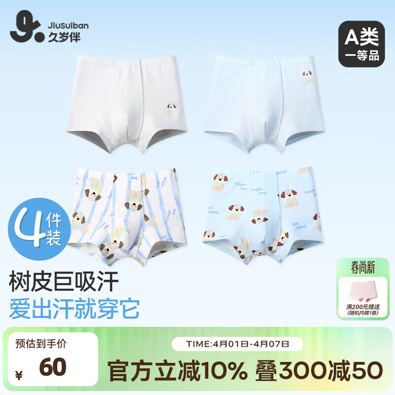 久岁伴儿童内裤男童平角裤A类优可丝3-6岁中小童7A抑菌蚕丝底档四角短裤 4条装【7A抑菌】 140
