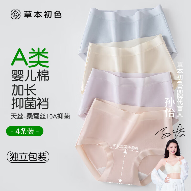 草本初色【A类婴儿棉】女士内裤女全纯棉10A桑蚕丝抑菌中腰无痕透气三角裤