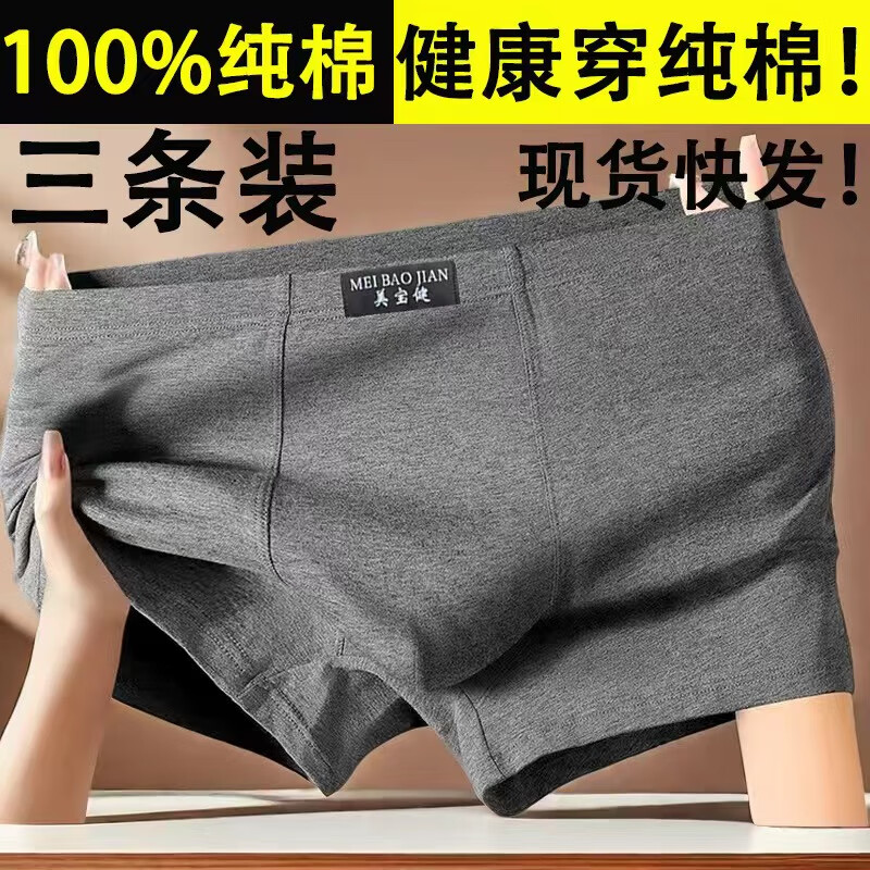美宝健100%纯棉3条装男士内裤透气平角裤青年裤头加大码宽松底裤四角裤 (3条装100%纯棉)颜色随机 3条 3XL (130-150斤)纯棉