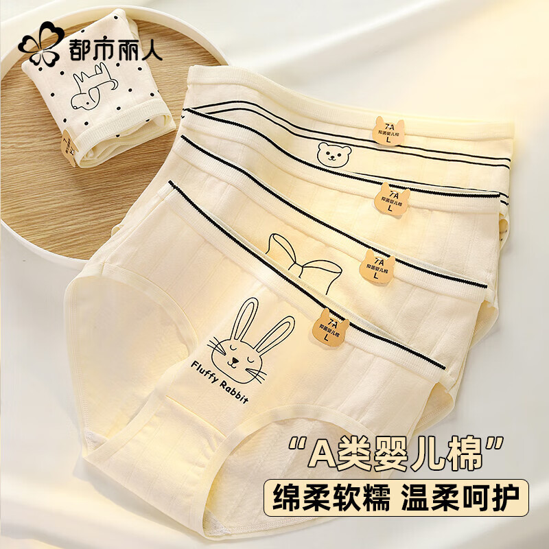 都市丽人女士内裤女7A抑菌全棉底档婴儿棉中腰柔软透气舒适甜美少女短裤 小兔子+小狗+小熊+单个蝴蝶结 4条 XL 建议【105-135斤】