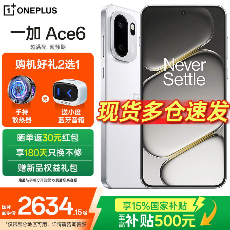 一加 Ace 6 【国家补贴】高刷电竞学生游戏手机 大容量长续航闪充 全网通5g智能手机 骁龙8至尊版 闪白 12GB+256GB 官方标配【全国联保】