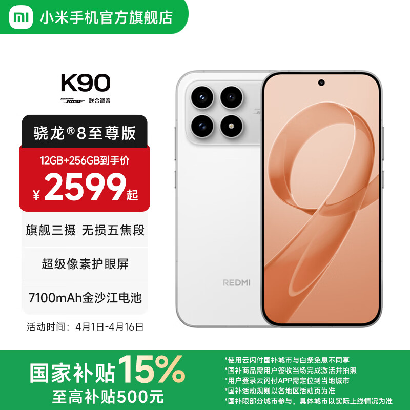 小米(MI)REDMI K90 6.59英寸手机红米k90 骁龙8至尊版 2.5X长焦 7100mAh大电池 Bose联合调音 IP68防尘防水 白色 12GB+256GB