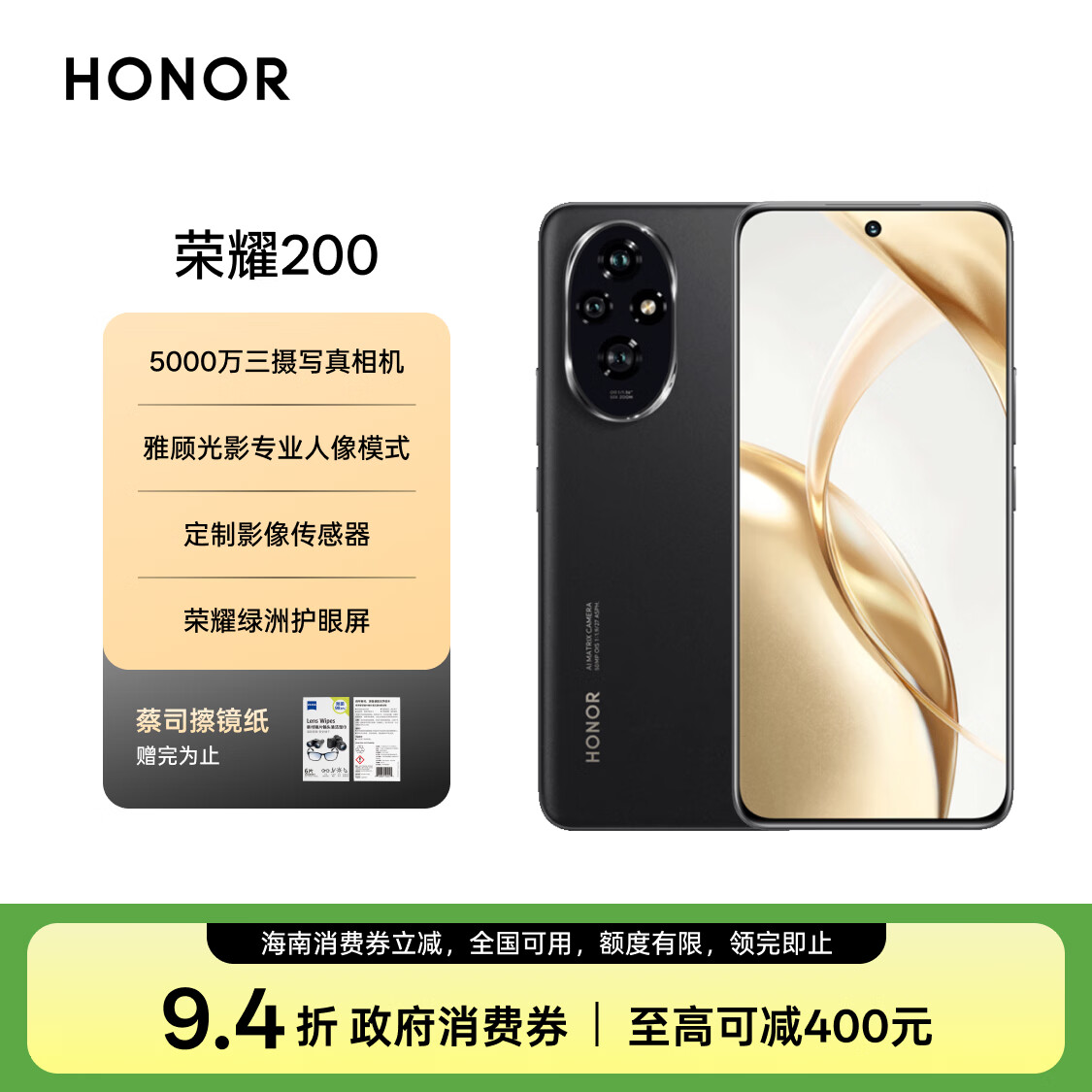 荣耀200 旗舰级青海湖电池 绿洲护眼屏 雅顾光影主摄 16+512 绒黑色 拍照5G AI智能手机 海南消费券