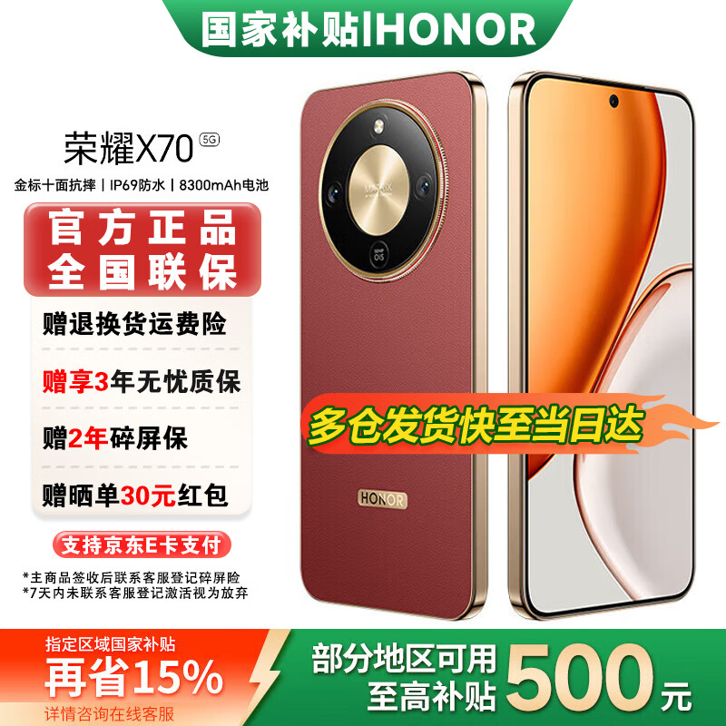 荣耀X70 新品上市 5G AI智能手机 国家补贴15% 金标十面抗摔防水 手机荣耀 朱砂红 8GB+256GB 官方标配
