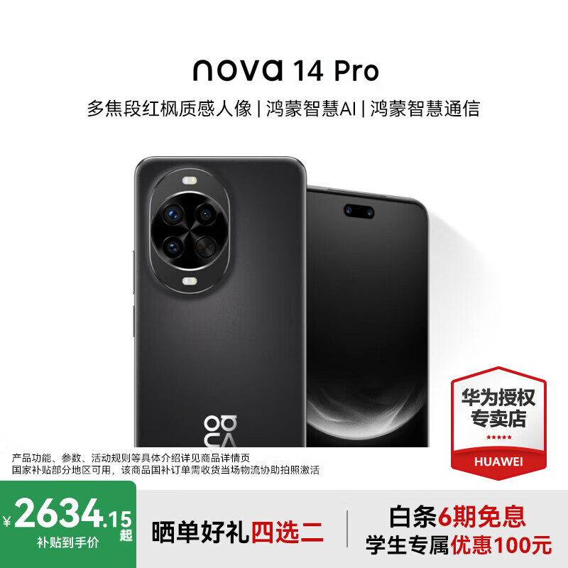 华为nova 14 Pro 国家补贴 鸿蒙AI 多焦段红枫质感人像 鸿蒙智能手机 羽砂黑 12GB+512GB 官方标配