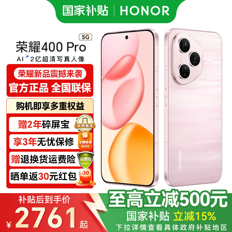 荣耀 400 Pro【国家补贴15%】 新品 5G手机 流沙粉 12GB+256GB 官方标配