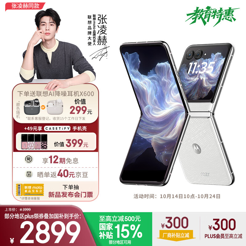 摩托罗拉 【张凌赫同款】联想moto Razr 60 第6代折叠屏 IP48级防尘抗水 自由悬停拍 12+512棉花糖白