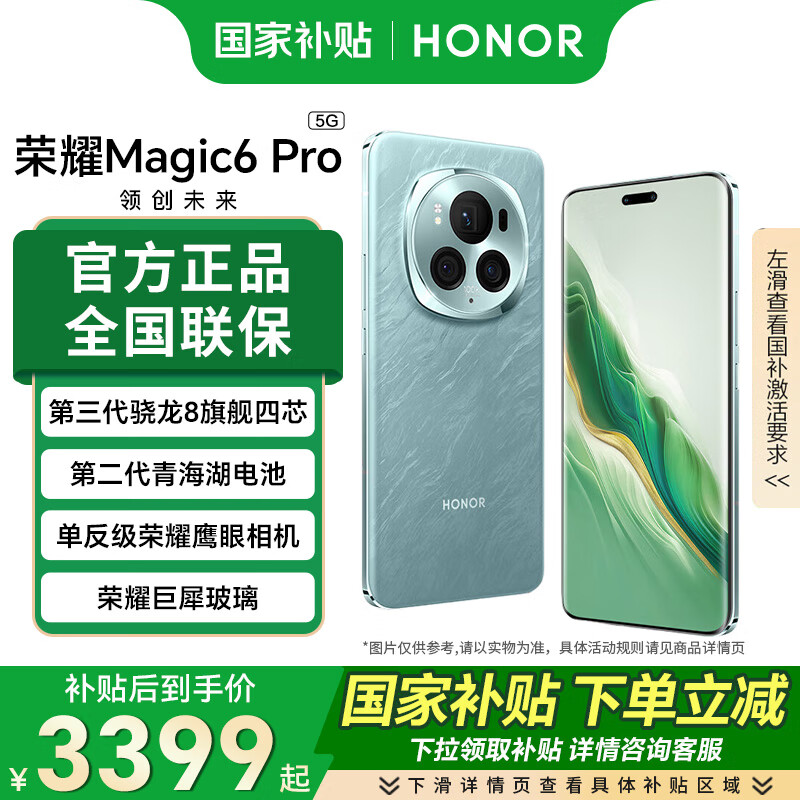 荣耀Magic6 Pro 5G全网通手机 荣耀鸿燕通信 荣耀巨犀玻璃 第三代骁龙8 AI手机 海湖青 16GB+512GB