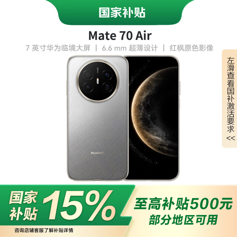 华为(HUAWEI)【国家补贴15%】Mate 70 Air 超薄长续航 7英寸华为临境大屏 红枫原色影像 鸿蒙手机 金丝银锦 12GB+512GB 官方标配