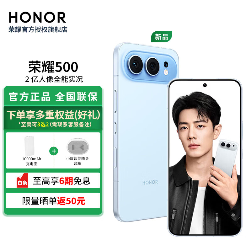 荣耀500 超级标准版 肖战同款 2亿人像全能实况 青海湖电池 5G AI 学生 新款拍照手机【白条分期】 海蓝宝 12GB+256GB 官方标配