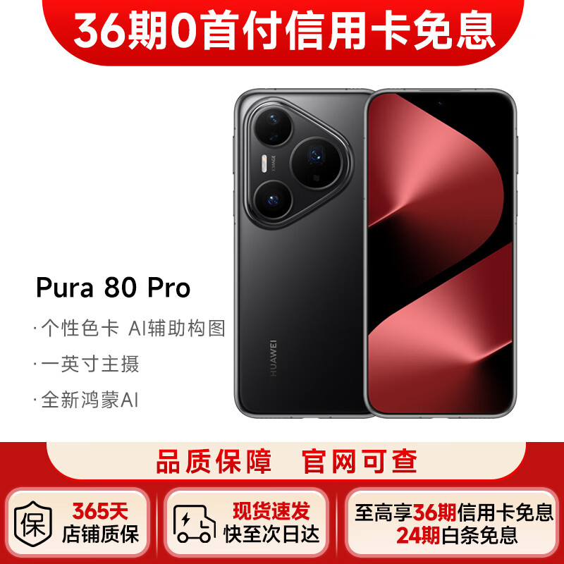 华为【36期免息0首付】pura80pro新品24期分期手机鸿蒙系统 釉黑 12GB+256GB 白条24期免息