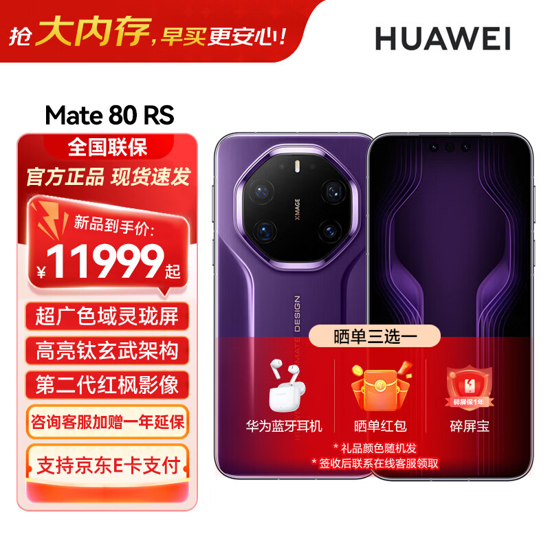 HUAWEI Mate 80 RS 非凡大师 麒麟9030 Pro 超广色域灵珑屏高亮钛玄武架构华为直屏鸿蒙手机 槿紫 20GB+512GB 官方标配