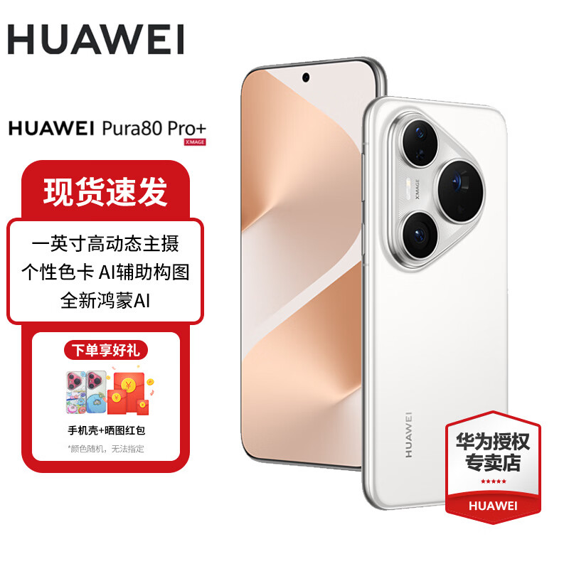 华为(HUAWEI)Pura 80 Pro+ 鸿蒙智能华为手机 一英寸高动态主摄 个性色卡AI辅助构图 p80pro+ 釉白 16GB+512GB 官方标配