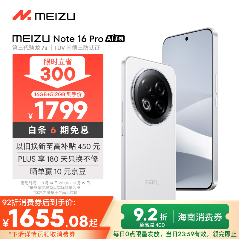 魅族(MEIZU)Note 16 Pro AI手机 16GB+512GB 流云白 第三代骁龙7s 144Hz 1.5K护眼屏