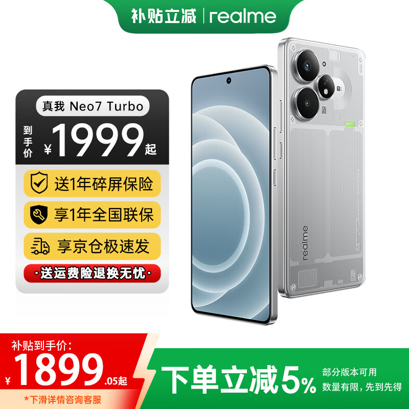 真我【政府补贴】realme真我Neo7 Turbo新品5G拍照游戏电竞手机天玑9400e 7200mAH电池长续航+100W快充 12+256 透明灰 官方标配丨咨询客服选豪礼