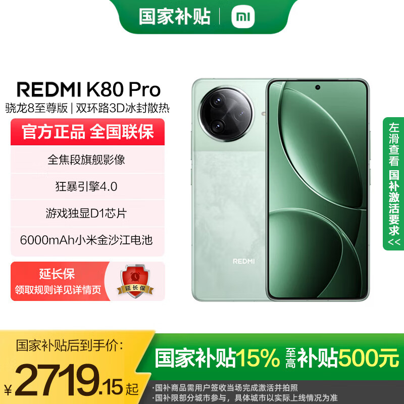 小米红米k80pro 国家补贴 新品5G手机 小米红米手机 骁龙8®至尊 游戏手机 山峦青 12GB+256GB 官方标配