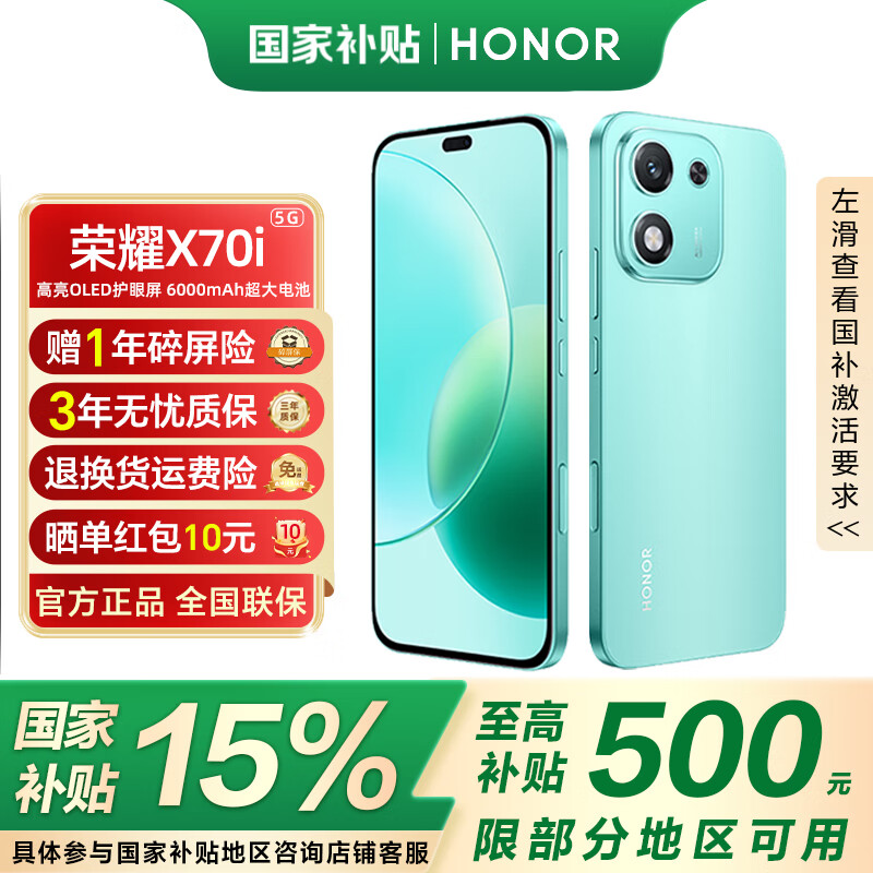 荣耀X70i 【国家补贴15%】5G手机 一亿像素 AI拍照键 大屏AI 高亮OLED护眼屏 超轻薄 天海青 8GB+256GB 官方标配
