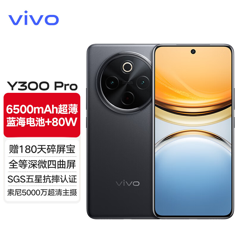 vivoY300 Pro 5G手机 6500mAh蓝海电池 80远航闪充 7.69mm超薄机身 索尼5000万超清主摄 墨玉黑 12GB 512GB