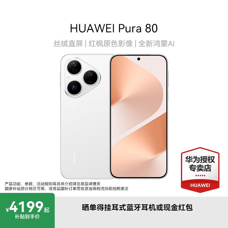 华为(HUAWEI)Pura80 丝绒直屏 红枫原色影像 全新鸿蒙AI 华为鸿蒙智能手机 华为P80智能手机 丝绒白 12GB+256GB 官方标配