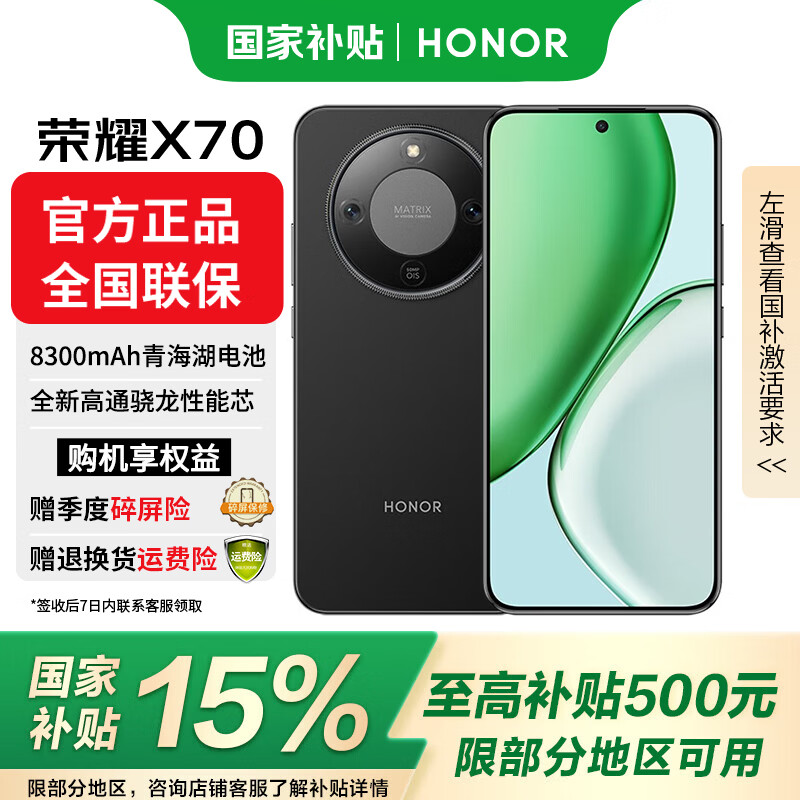 荣耀X70 金标十面抗摔 8300mAh青海湖电池 IP69防水 荣耀绿洲护眼屏 AI手机 国家补贴 幻夜黑 12GB+512GB