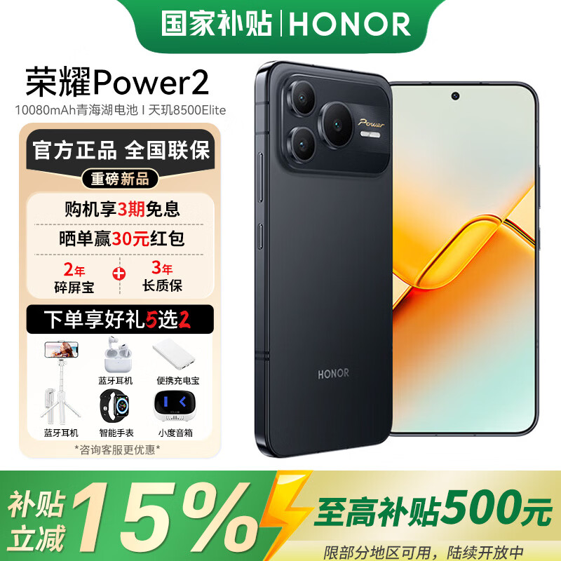 荣耀Power2【国家补贴】5G智能手机 长续航10080mAh青海湖电池 防水防尘 天玑8500Elite 手机荣耀AI 幻夜黑 12GB+512GB 官方标配
