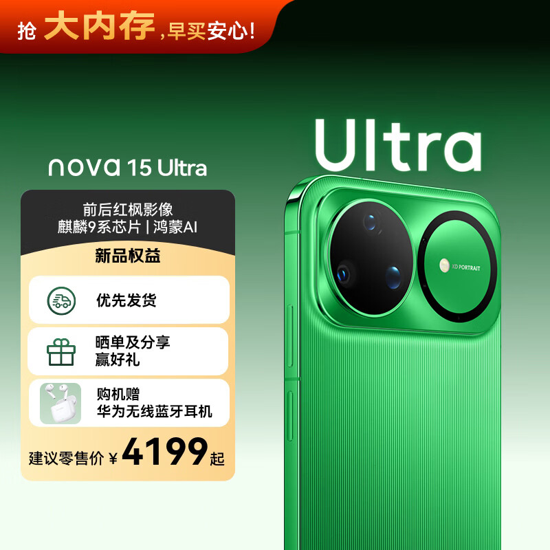 华为(HUAWEI)nova 15 Ultra 麒麟9系芯片 前后红枫影像 鸿蒙AI 超动态臻彩护眼屏鸿蒙智能官方正品华为手机 带感绿 12GB+512GB全网通