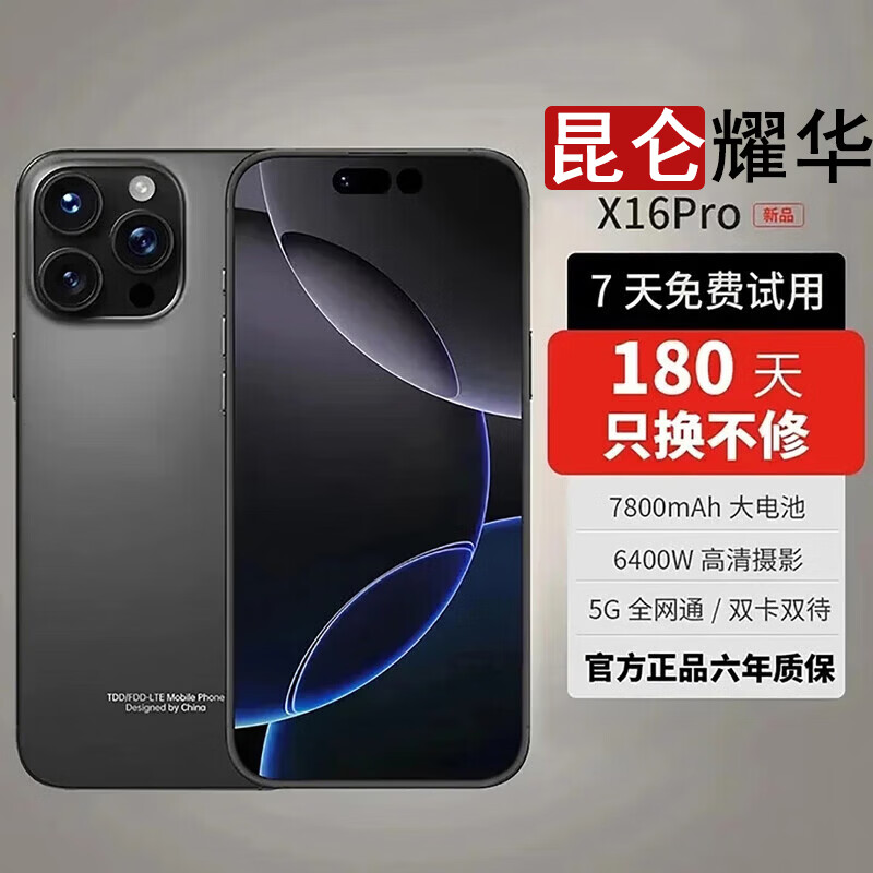 昆仑耀华X16Pro手机2026新品6年质保5G双卡全网通1TB大内存7800mAh快充大电池抗摔防水高清护眼拍照 钛黑色 16GB+1TB
