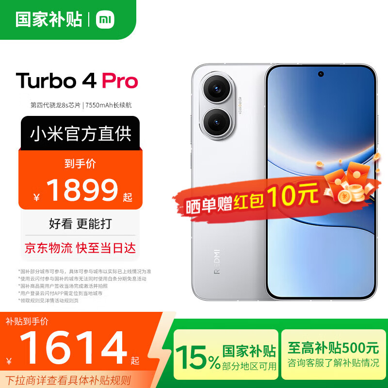 小米REDMI 红米Turbo 4 Pro 【国家补贴15%】 新品5G手机 第四代骁龙8s 7550mAh 长续航 白色 12GB+256GB 官方标配