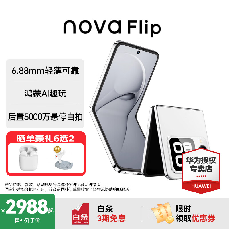 华为nova Flip 小折叠 国家补贴 轻薄可靠 鸿蒙AI趣玩 后置5000万悬停自拍智能手机 零度白 256GB 官方标配