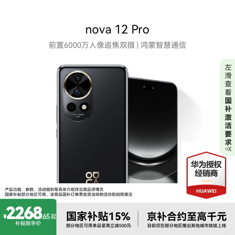 华为nova12Pro 512GB 曜金黑#4K超广角镜头前置6000万人像追焦双摄 100W快充手机国家补贴【赠流量卡】