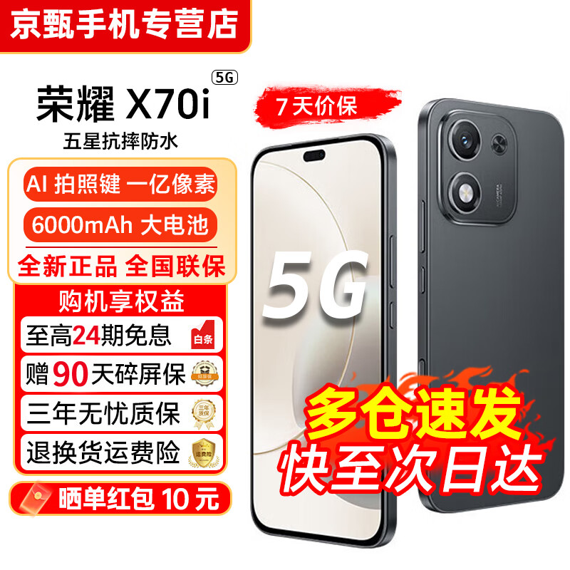 荣耀x70i【24期免息】5G全网通 一亿像素 AI拍照键 大屏AI 高亮OLED护眼屏 超轻薄大电池 银发人群手机 绒黑色 12GB+512GB【晒图赠蓝牙耳机】 官方标配【赠2年店铺延保+90天碎屏保】