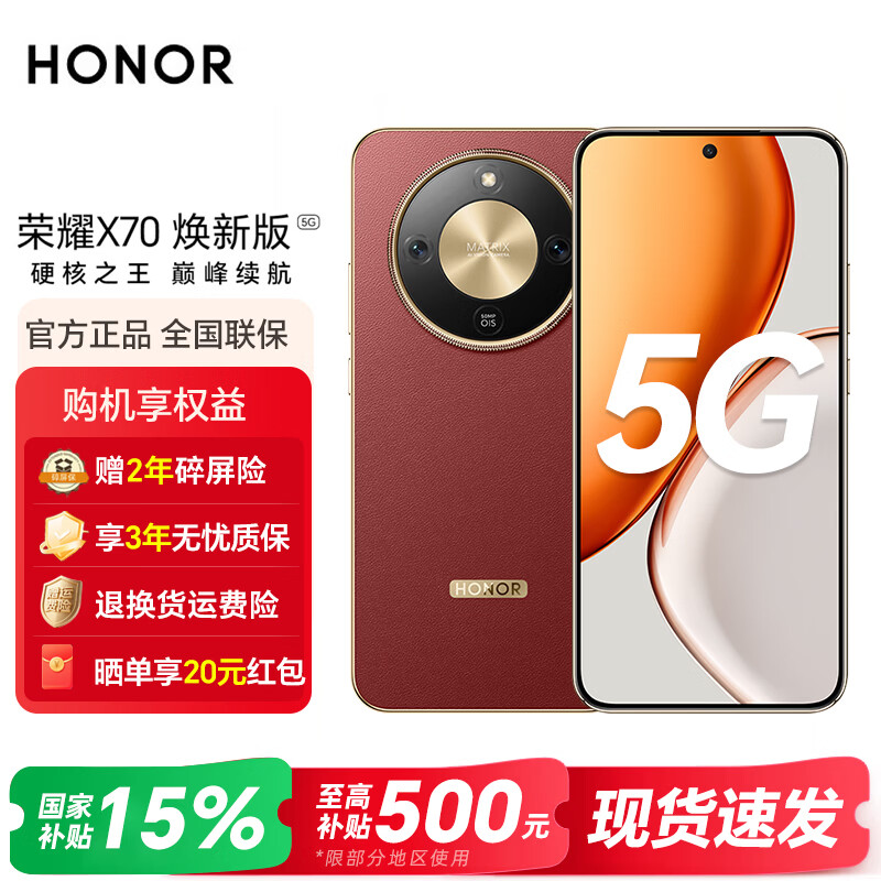 荣耀X70 焕新版 【国家补贴15%】 5G手机 十面抗摔 8300mAh青海湖电池 荣耀绿洲护眼屏 AI手机 朱砂红 12GB+512GB 官方标配