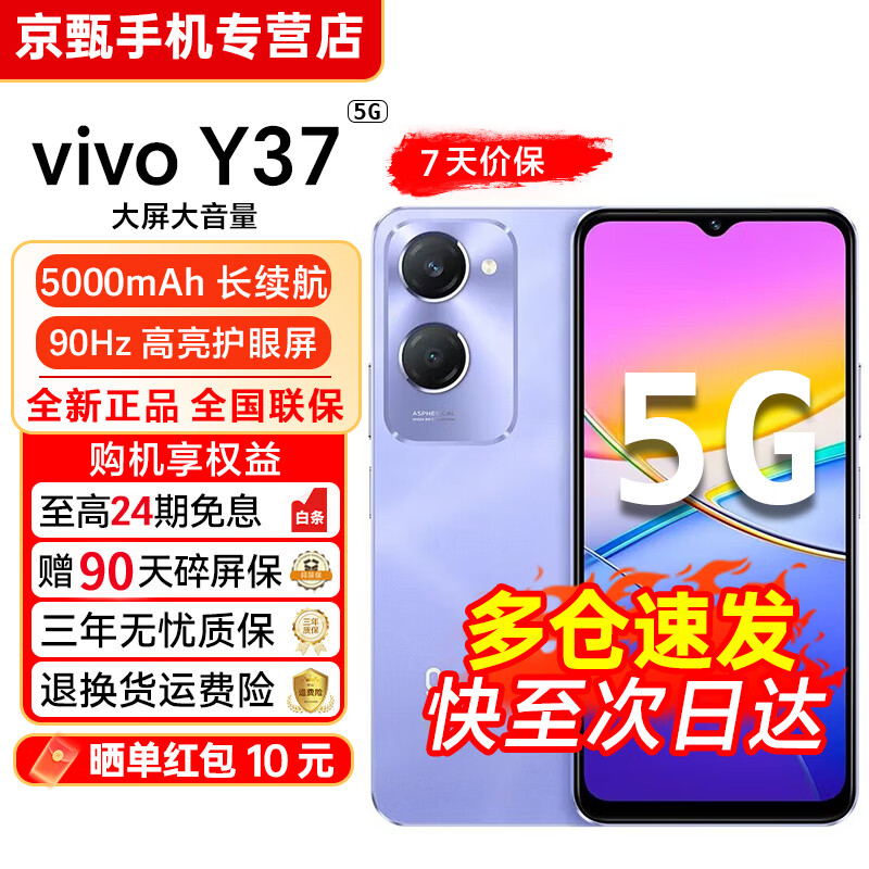 vivo Y37【24期免息】5G全网通 5000mAh电池 90Hz高亮护眼屏 八核处理器 超大内存 老年人学生手机 菱光紫 6GB+128GB【晒图赠蓝牙耳机】 官方标配【赠2年店铺延保+90天碎