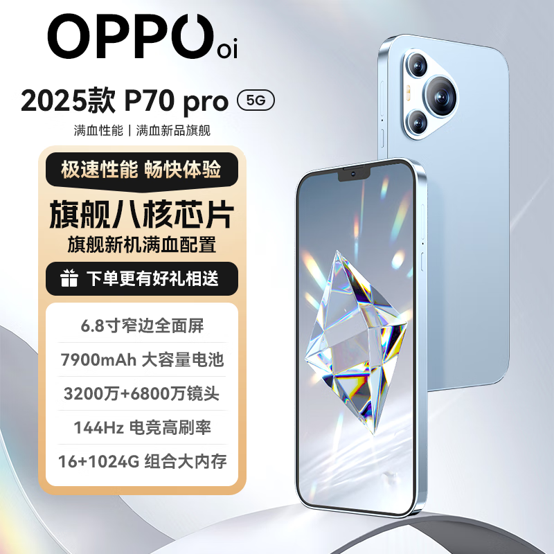 OPPUOI手机2025新款上市P70 Pro1TB大内存16G运行 144Hz高刷7900mAh大电池超续航游戏办公学生老人全网通 冰晶蓝 豪华版16G+1024G 【全新未拆封+送豪华礼品+质保三年】
