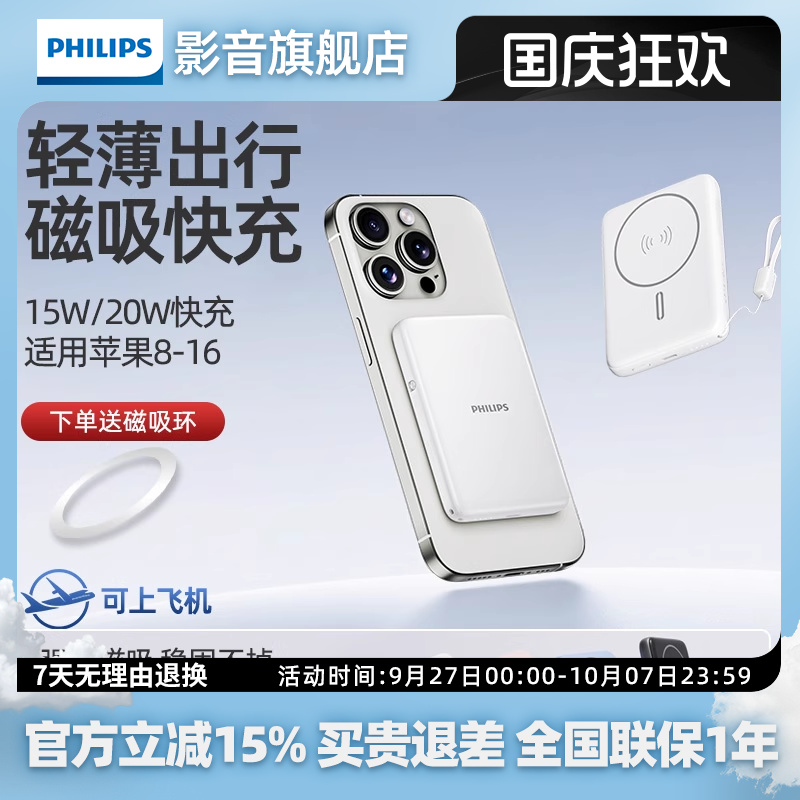 【3C认证】飞利浦DLP9220无线磁吸超薄充电宝便携适用于小米苹果手机可上飞机10000mAh自带线快充移动电源
