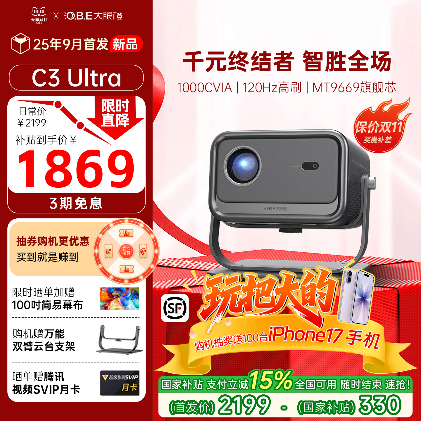 【重磅新品全国补贴】大眼橙C3Ultra投影仪家用高清超亮高刷可连手机2025新款卧室放映机1080P无需幕布投屏墙