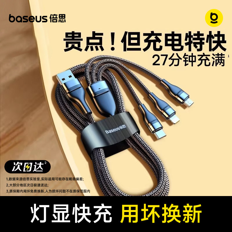 倍思数据线三合一充电线器66W手机快充一拖三6A适用苹果17华为安卓typec三头mate60Pro车载iPhone16多功能5A