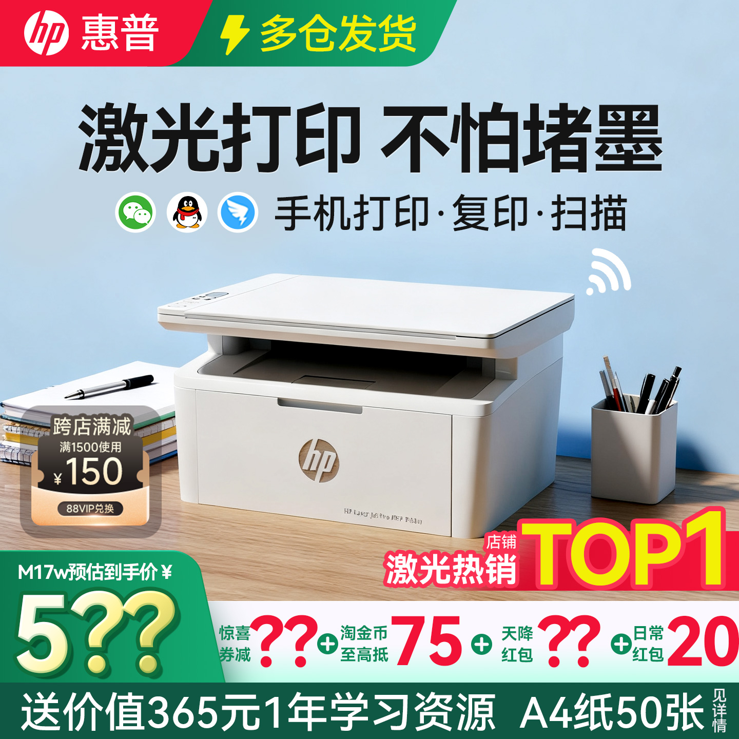 惠普M30w黑白激光无线打印机小型家用复印扫描一体机17可连手机学生作业A4家庭办公专用117W办公室wifi三合一